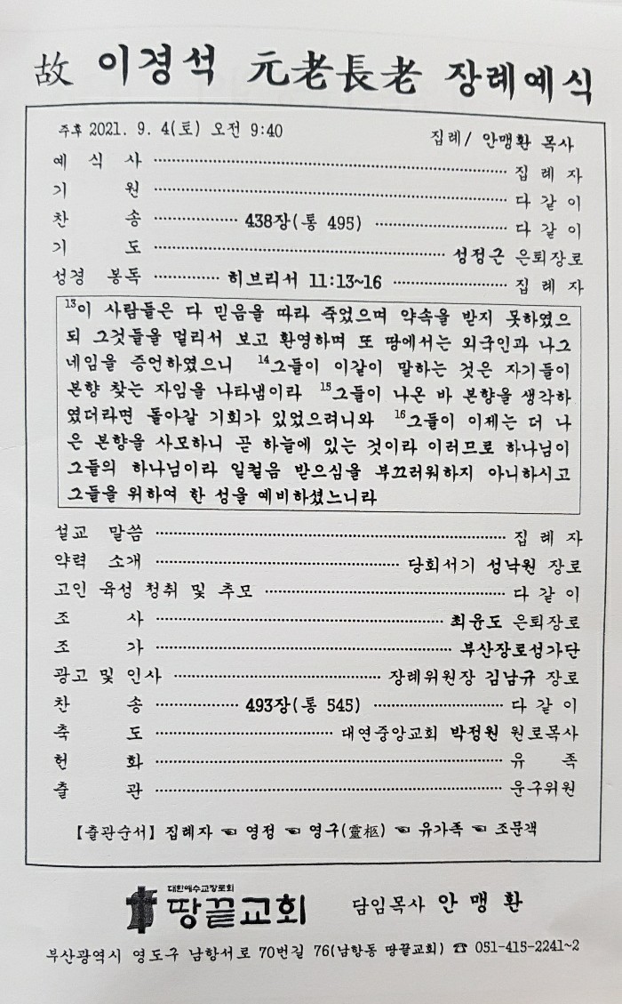 @ 발인 - 2021년 9얼 4일 (토요일) - 땅끝교회 교회장